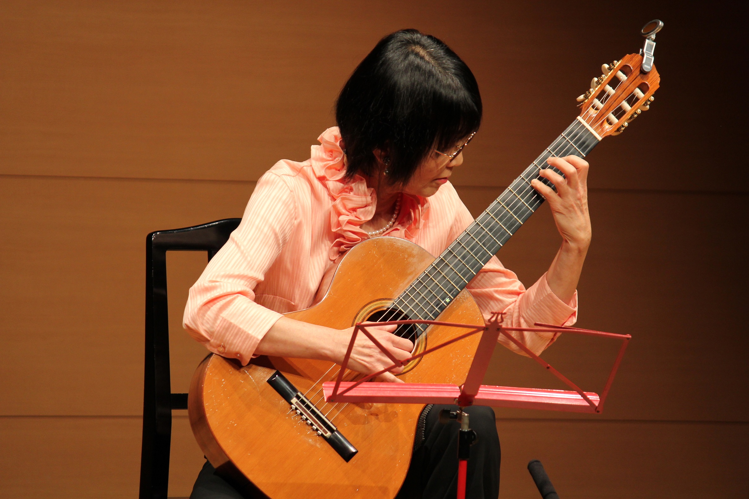 春美さんのギターには、本当にいつも心和みます。もうれっきとした女流ギタリストですネ~!技術的な安定感、そしてお人柄の優しい音楽性。「春美さんのようにギター弾きたい~!」という声を私は良く耳にします。独奏でも重奏でも、安定したギターは立派なものです。そんな春美さんも、そう、確か9回目の発表です。特筆ものですが、春美さんは今でも必ず①アル・アイレ②音階(スケール)をしています。歯磨き的基本練習の重要さ、それを怠らず続けていらっしゃる春美さん、良くて当然ですネ~ 「ノクターン」が特に良かった~!!