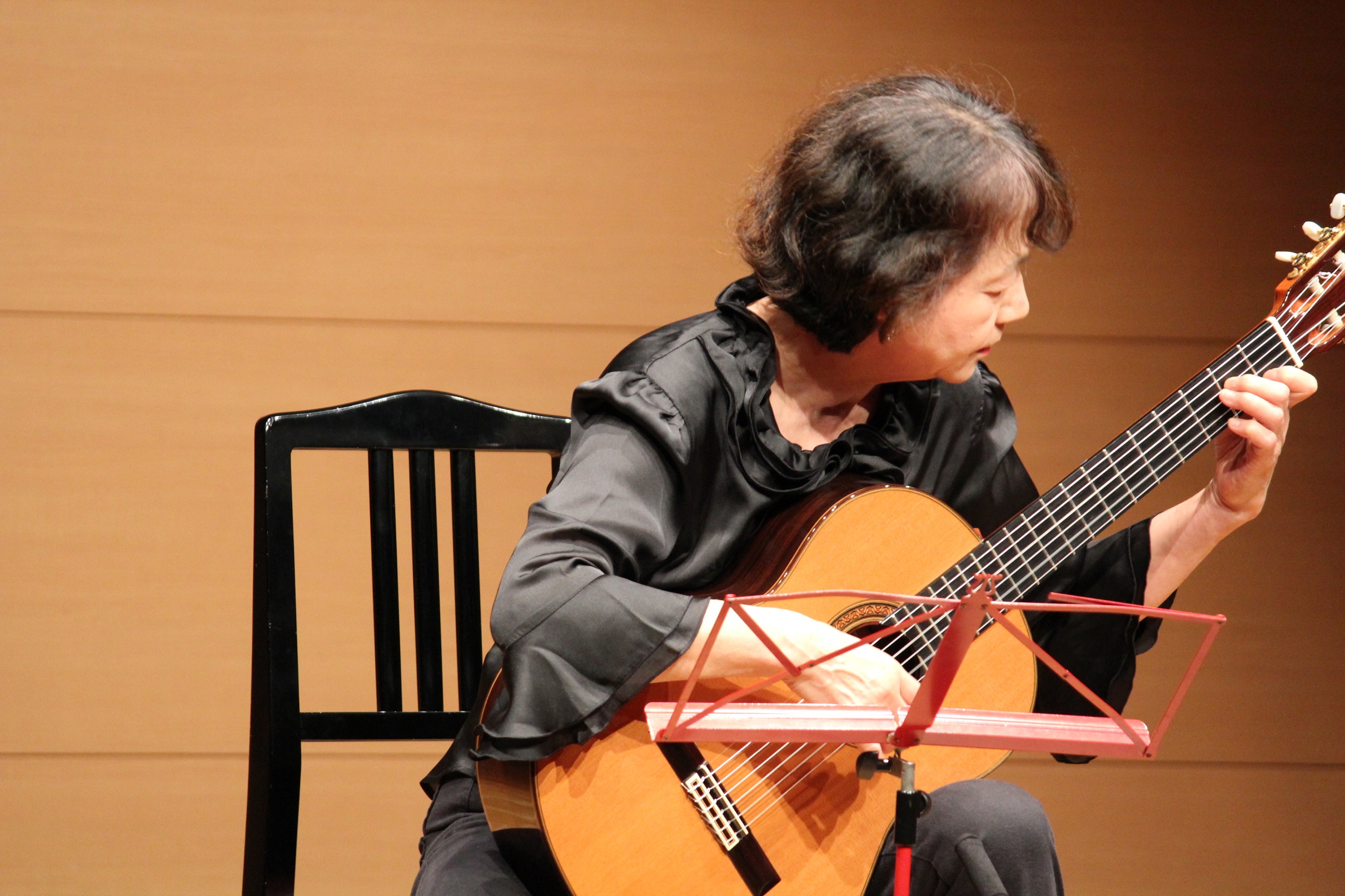 本発表会の最後の発表はTさんです。Tさんも、確か9回発表されています。ギター歴は長く、そんな意味では“ギターのツボ”みたいなことも良くご存知のTさん。でも、Tさんも練習は熱心ですヨ~!技術もかなりの精度で安定し、今は「楽譜から如何に“音楽”を読み取るか?そして、その表現はどのようにすれば良いのか?」という域まで来られています。レッスン中に私とよく話し合うこと、それは「ギターは、心の音楽表現の道具なんだヨネ~?」と… そこまでの域に来られたTさんの発表、舞台傍で聴いていた私は、GOOD!と叫んでしまいました!