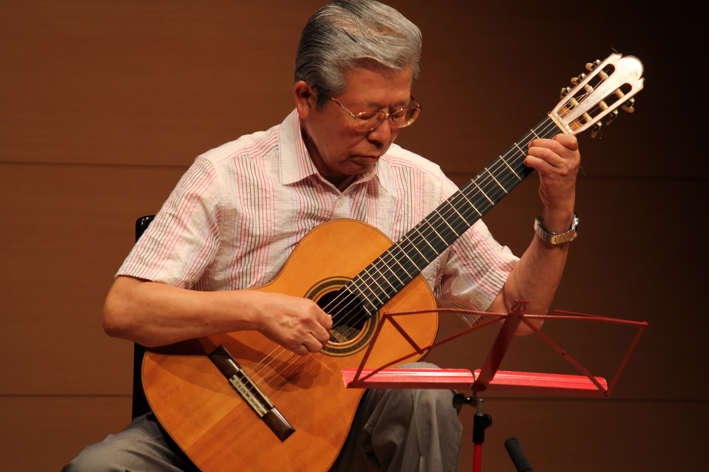 Iさんも、ナント、10回連続の発表です。拙研究所のレッスン生全員の精神的支柱のIさん、私は頭が下がることばかり。御人柄といい、物事の考え方といい、もう私は「Iさんのように歳を重ねていきたい!」と思うこと、しばしば!定年退職を契機に始められたギターだそうですが、練習熱心なこと、それに常に問題意識を持ってギターに接していらっしゃる!「先生のような音がなかなか出な~い!」とは、Iさんの口癖。「アルハンブラの思い出」を、70歳頃から取り組まれ、今ではIさんにとって愛奏曲の域に入って来ましたこと、これはこれは本当に大変なこと!そんなIさんの発表演奏、言わずもがな、感動を頂きました!