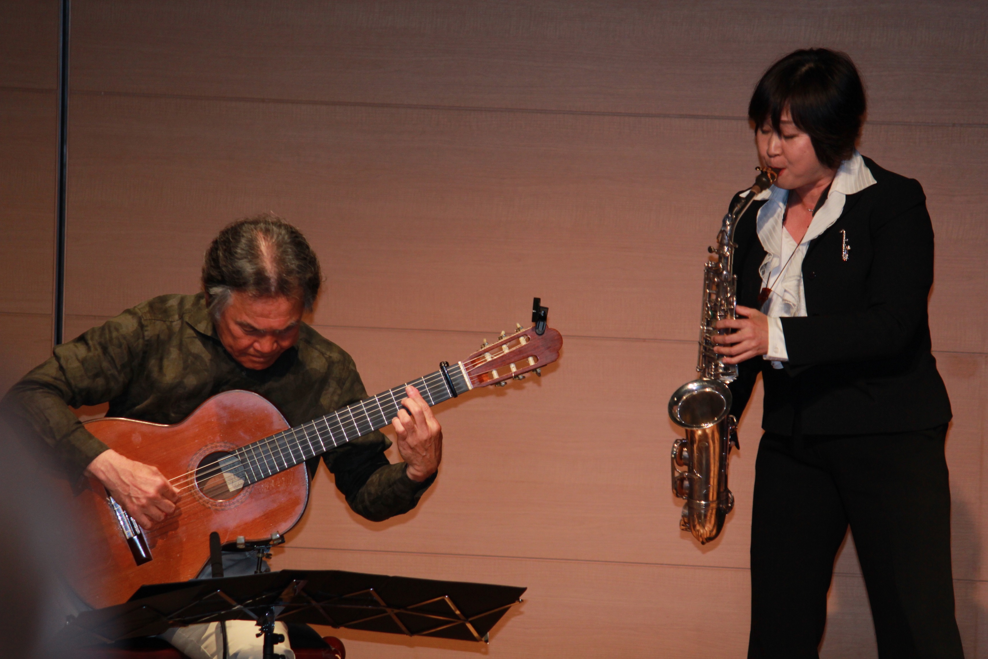 たぶん、殆どのお客様が「エ~ッ?サックスとギター??」という驚きだったのではないでしょうか?? 楽器を少しでも触れたことのある方でしたら心配しちゃいます。管楽器のほうが音量があり、ギターは音が小さい! そのバランスは??と...でも、本間さんのバランスを考慮した歌心たっぷりサックスで、さぞかしホッとされたことでしょう。拙作の「ロマンティック・メイ」は、そんな意味では、数少ないソプラノ・サックスとギターの二重奏曲ですので、一聴のモノだったはず!と手前味噌で思っておりますが...続くスタンダードの名曲を2曲、特に「ワルツ・フォー・デビー」は、ギターソロが特に難しかったです。それは、サックスのキーとの調合のため、私はカポタストを使用しました。いわゆる、ポジションが1フレットずつズレる“1カポ”編曲にしましたんで、未熟な自分をこの曲でどんなにか思い知らされたことか??!!