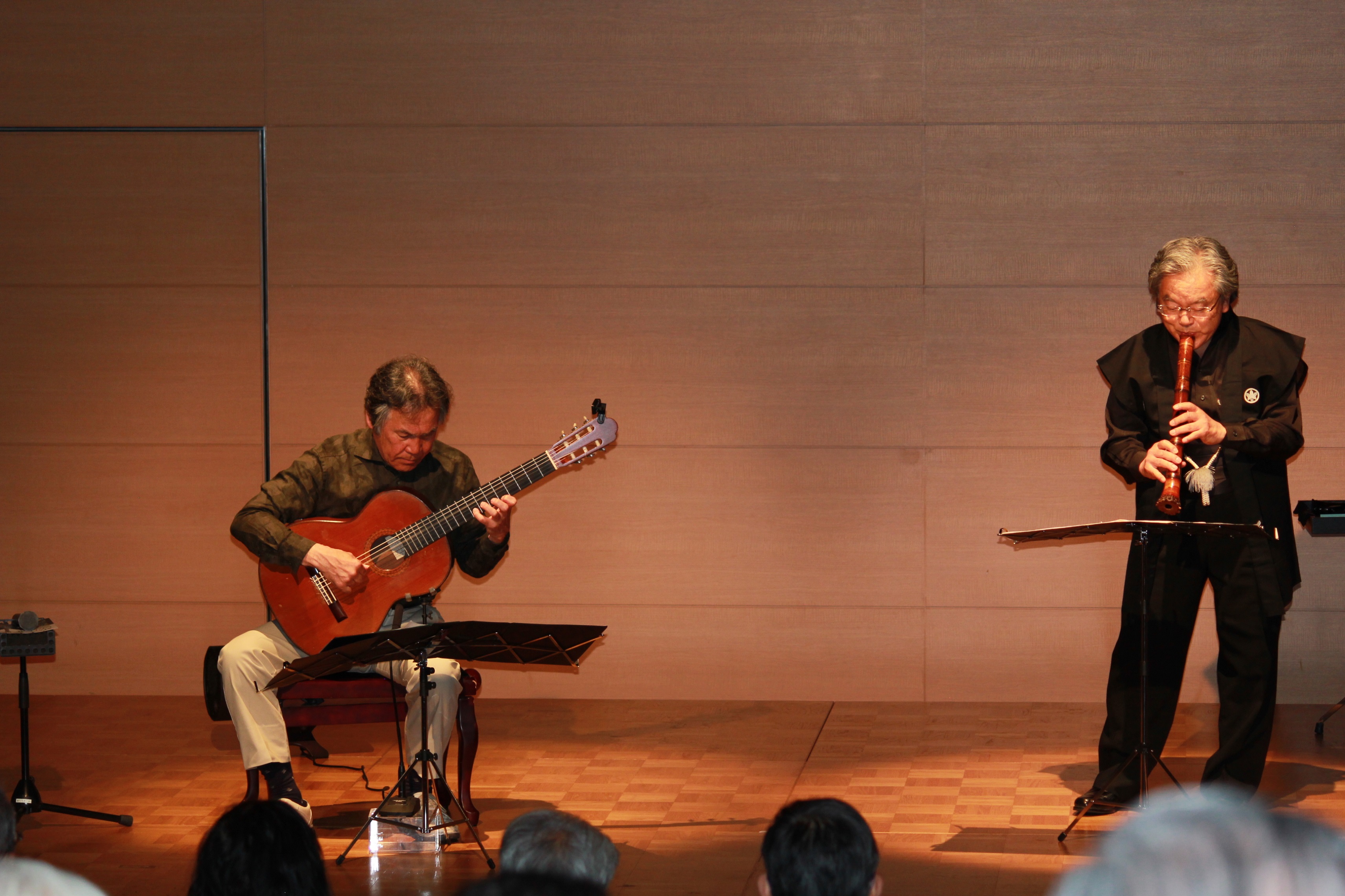 すっかりお馴染みになりました尺八とのコラボです。 金野さんとは、そう、20年超えて一緒に演奏しております。尺八とギターのDUO、ウ~ン、まず聴いていただかないと何とも言えません。先のサックスとのDUOもそうですが、私のスタンスは「音楽ありき!」ですので、既成のやり方などは、参考にするだけです。“音楽”をすれば良い!、のです。「金野さんは尺八で、私はギターで!音楽をする」ということだけです。