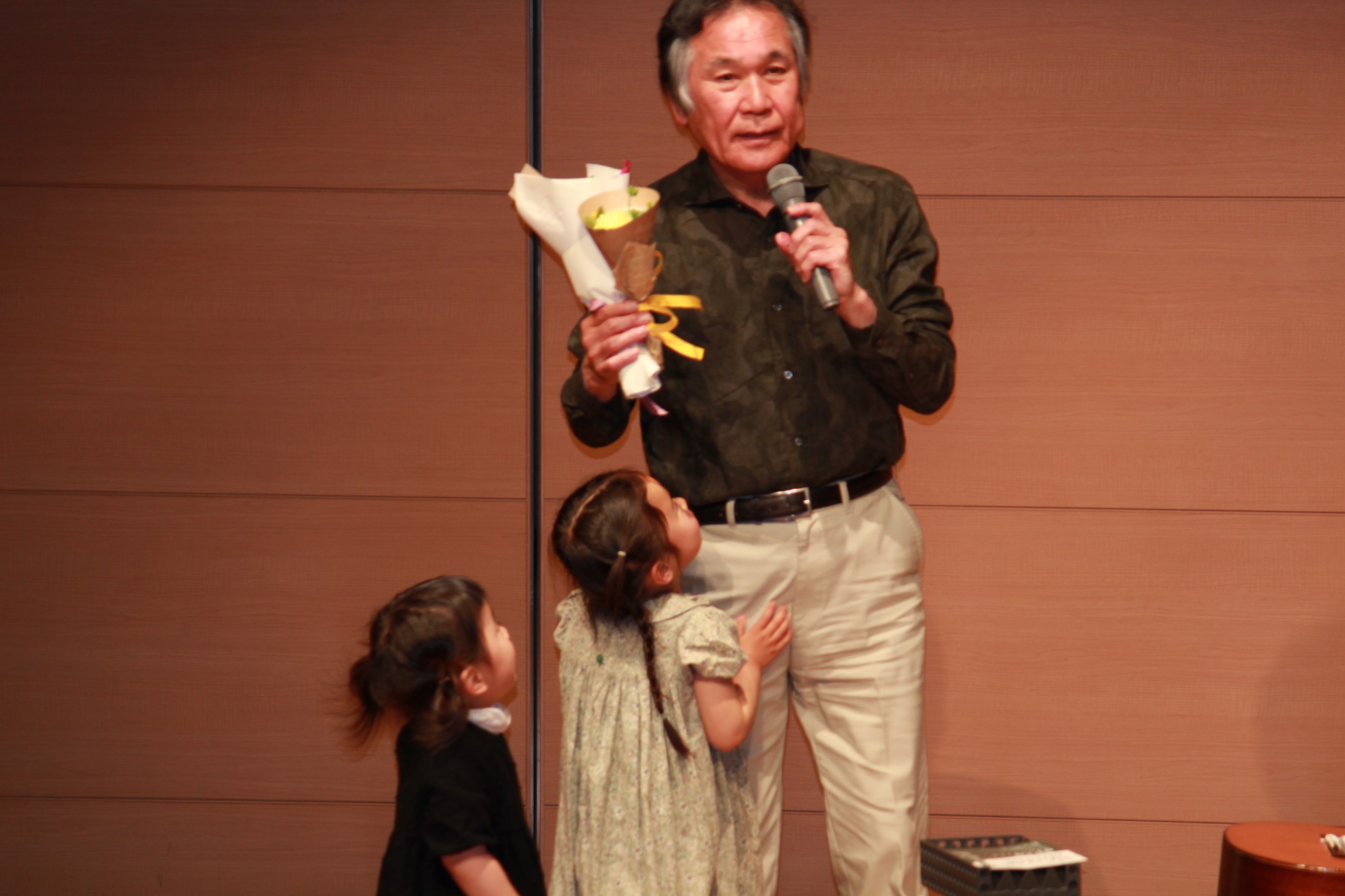 突然のハプニング、孫たちが花束を持って壇上に上がり、寄ってきました~! 言葉にならない気持ち?? 大変我が儘な演出に思われたかもしれません。でも、お客様方からは、大変な拍手をいただきました!! 私の素顔を晒しだした感じで、ご勘弁願いたいです~!! 「この子たちのために、俺はギター弾いてんだ~!!」とも思った瞬間でした~!