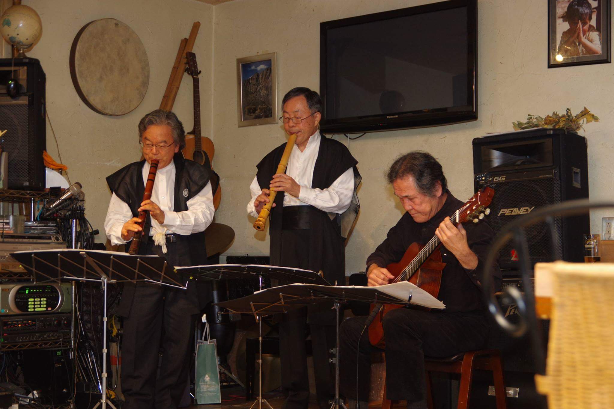 さて、今回のライヴですが、内容的に私自身満足のいく演奏ができ、嬉しかったものですからリポートさせていただきます。時は11月27日(金)、夕刻7時演奏スタートでした。今回のライヴへ、ナント、尺八の金野氏の知人が秋田から、そして同じ尺八の山城氏のかつての会社同僚の方が横浜から、とお出でくださいました。そんなわけで、演奏開始前から一種ピ~ンと気持ちが良い意味で張ってきまして、ネ~ 演奏内容は下記の通りです。