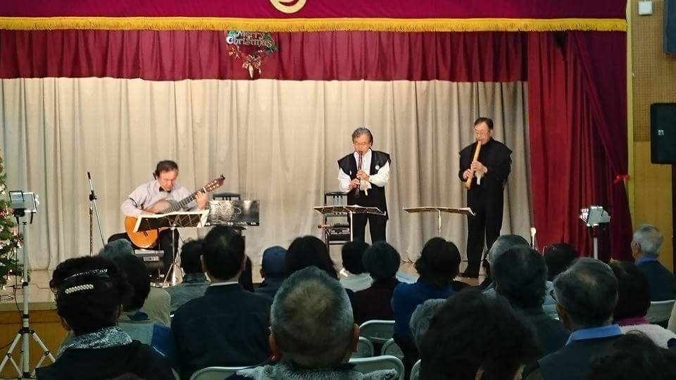 本コンサートで私が殊更嬉しかったのは、ご来場の皆さま(70名強)のマナーの素晴らしさ!でした。ですから、私なんかは最高にノッて演奏しちゃいました。会場は一般的な公民館講堂ですので、コンサート会場のような音響の良さは期待しておりませんでしたが、事前の下見した時の思惑通りで、期待した効果のあった演奏ができました。お客様方も大変喜んでくださって聴いてくれているのが如実に解り、本当に「やって良かった~!!」と、尺八の金野・山城両氏と帰途の車中にて話も弾みました。後日に、先の会長さん(高橋さま)よりご丁寧かつ達筆の礼状もいただきました。「この自治会は、今の会長さん&幹部の方々がいらっしゃる限り、益々盛会になるだろうナ~!」と、本当に頭の下がる思いのコンサートをさせていただきました。