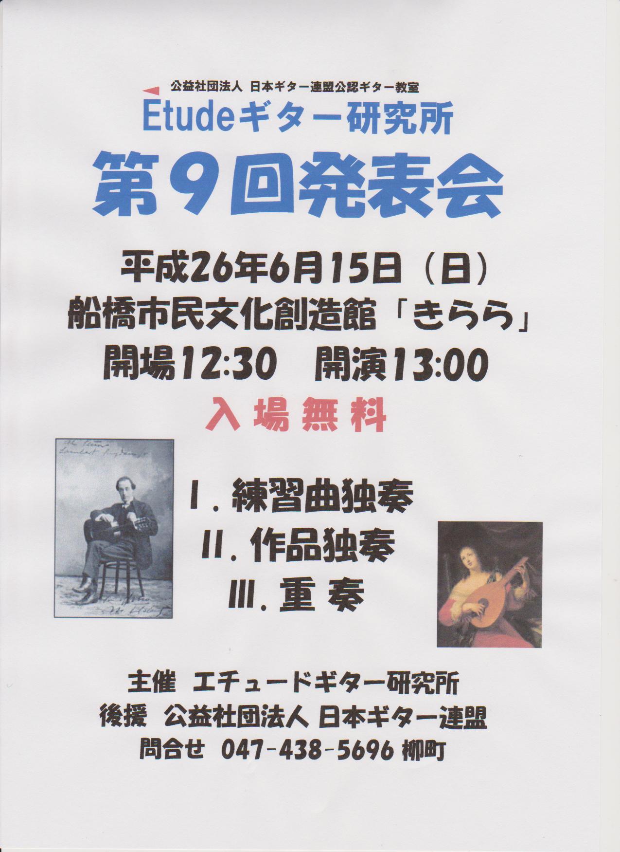 とうとうやって参りました!! 明日9回目の発表会です。今日も電車に乗っていましたら、船橋市広報をご覧頂いた方より「明日の発表会の場所を教えてください!」という、お問い合わせのお電話を頂きました。今回のお問い合わせは6件です。眞に感謝!です!! 発表するレッスン生皆さんの状況ですが、ウン、GOODですヨ、ハイ~ッ!! 私のほうのセッティング関連準備も万端です。本当に明日が楽しみでなりません。今頃のレッスン生の心境たるや、さぞかし緊張そのものかもしれませんが、もうここまで来れば!リハーサルも3回行いましたし、もう皆さん素晴らしい音楽家ですので私はレッスン生の皆さんの音楽に太鼓判!ですのでネ...ご来場のお客様方にも、絶対にギターの奏でる音楽の良さが伝わりますヨ!! 乞うご期待!です~、ハイッ!