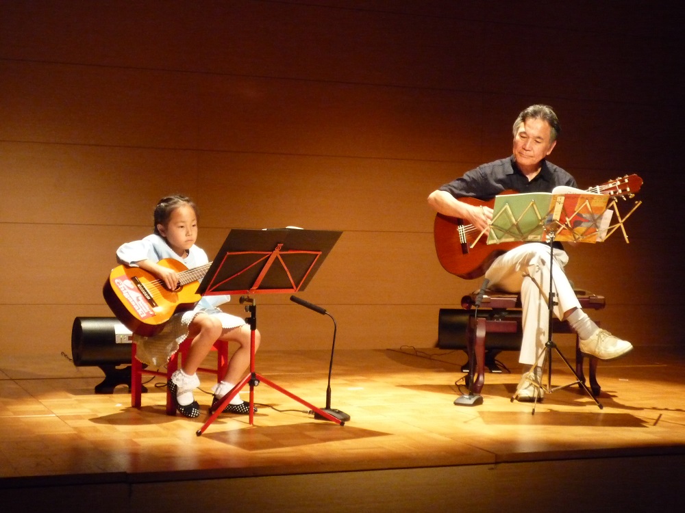 遊ちゃんは、今回が2回目の発表会。第1部<練習曲>では、①気のいいアヒル(ボヘミア民謡)②ワルツ(F.カルリ)を、第2部<作品>は、①小人のおまつり(伊東福雄)②1週間(ロシア民謡)、そして第4部<重奏>では①コーヒー・ルンバ(J.M.ペローニ)②真夏の果実(桑田佳祐)という、計6曲を、ものの見事に弾ききりました。昨年は、幼稚園年長さんで、初めての発表会でしたが、今年はナント、ピカピカの小学1年生での発表会です。他の大人のレッスン生の方々が緊張いっぱいの面持ちの中で、ユウちゃんは終始涼しげで落ち着いた表情でいました。(ビックリものですネ〜) まことに可愛らしい両手で、そして小さな指で6本の弦が爪弾かれるわけですが、出てくる音の明瞭さ!かつ、しっかりとしたリズム感で、特に「1週間」のだんだんと早くなるテンポも、実に楽々と楽しんで演奏しました。そして、「コーヒー・ルンバ」「真夏の果実」は、ユウちゃンの“ワクワク・ギター”が冴えまくり、会場から大きな拍手をいただきました!「これからどんなに上手くなるんだろう??」と、何人もの方から嬉しいお言葉をいただきました。